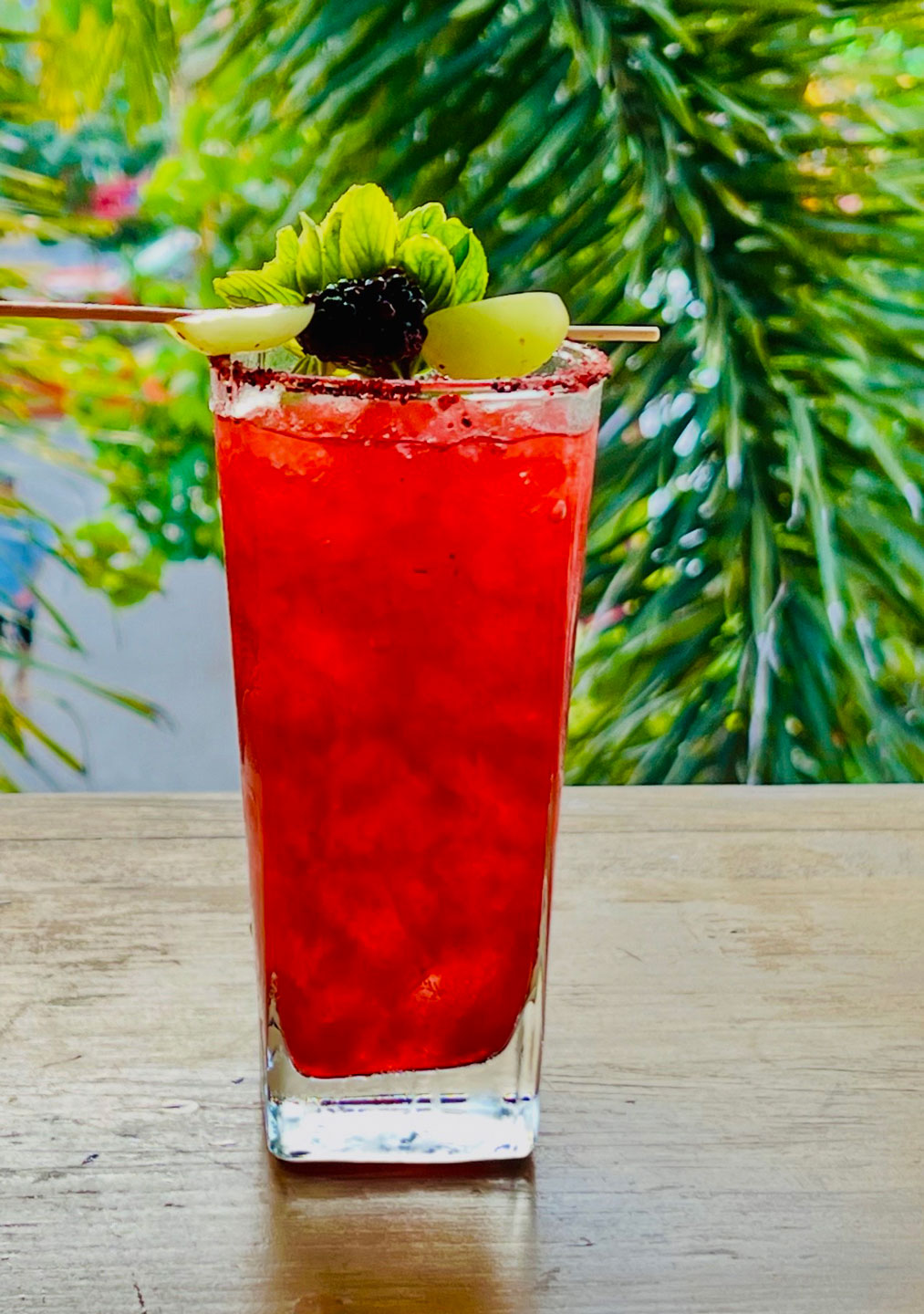 Mezcal Rey Campero, basil, blue berry, grapes, hibiscus syrup, lime