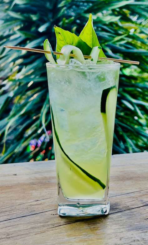 Basil, lemon, cucumber, syrup, Tanquery Gin and soda