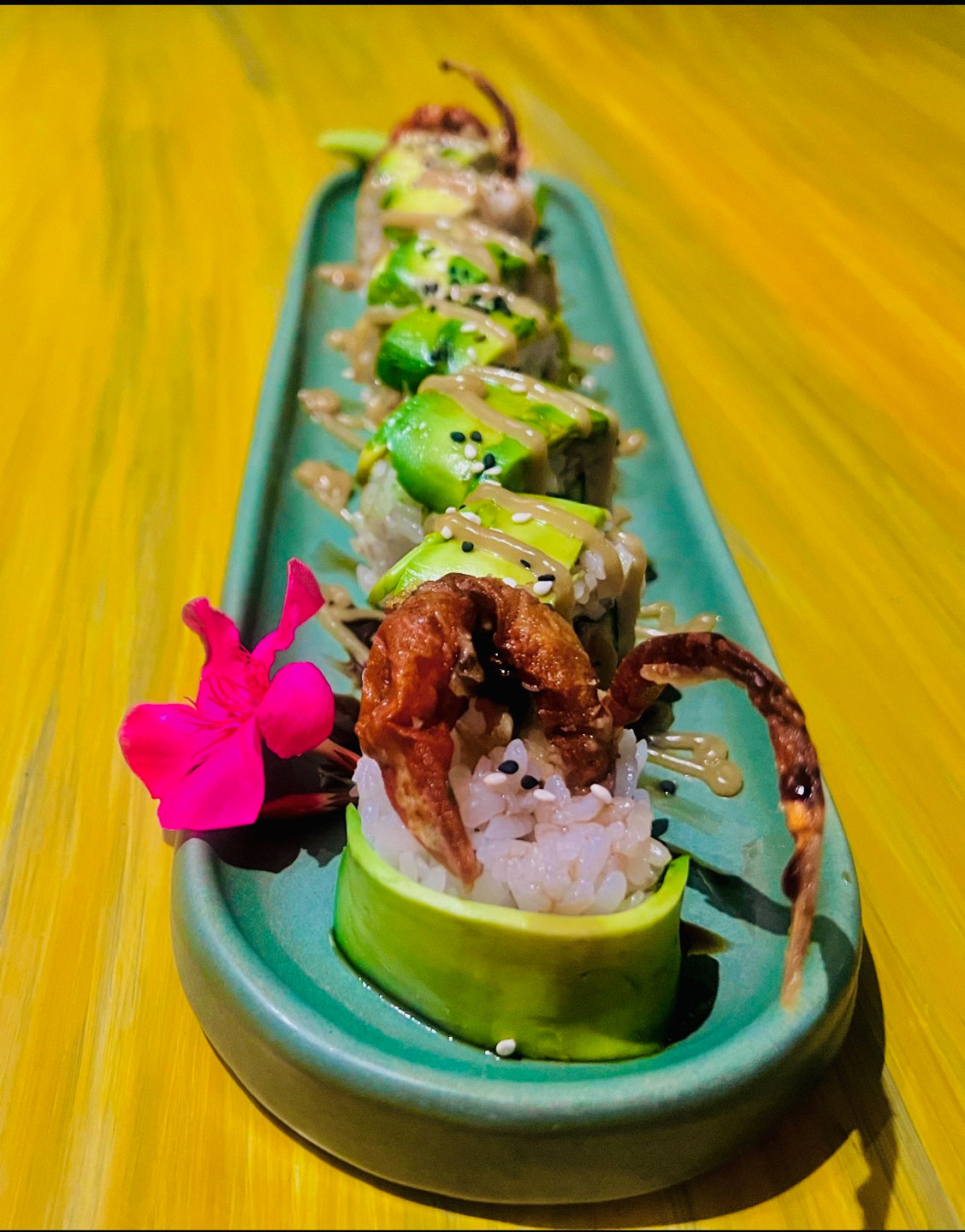 Shrimp tempura, cucumber, cream cheese, sliced mango and avocado, unagi sauce and sesame