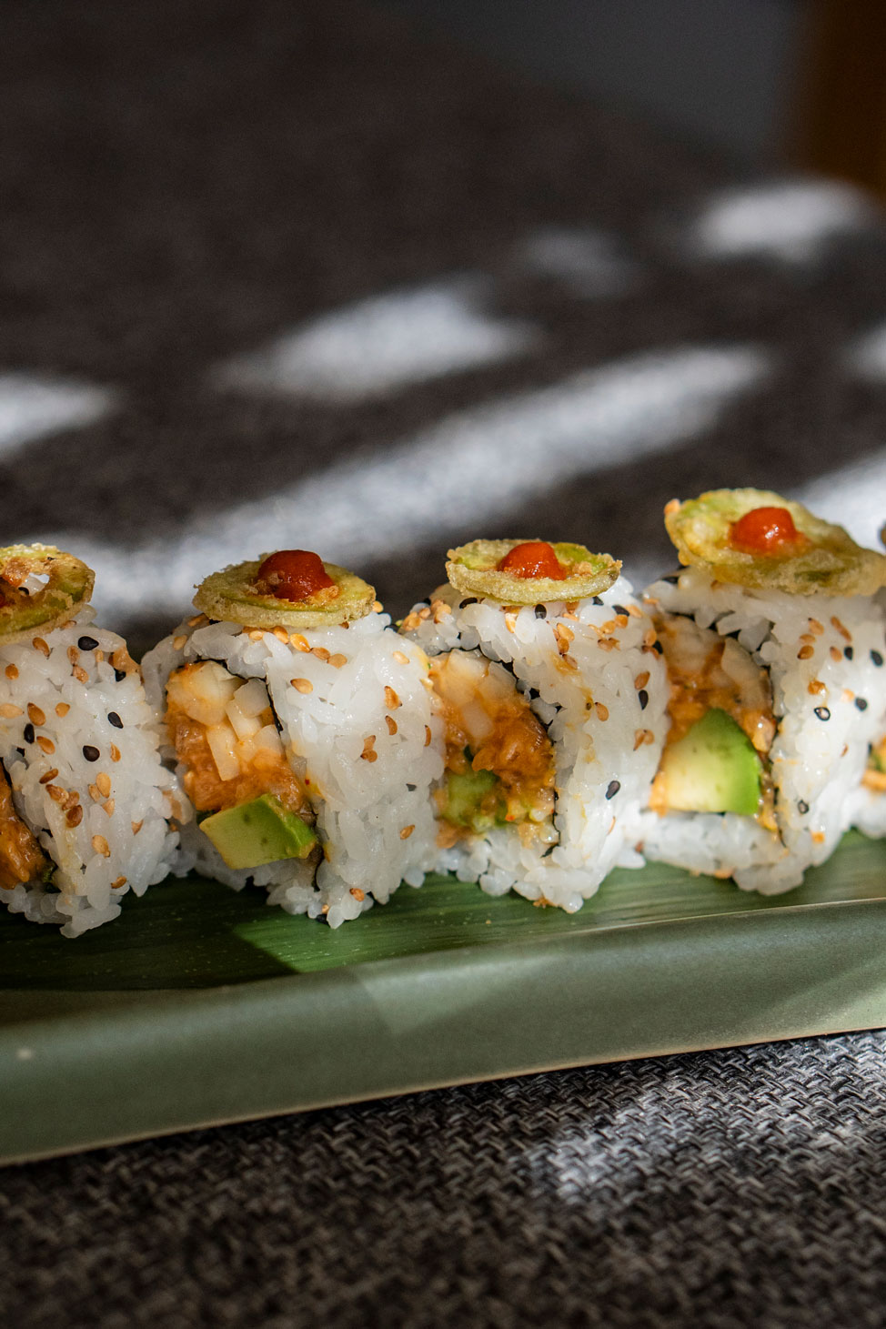 Aguacate, pepino, ajonjolí y tempura de jalapeño