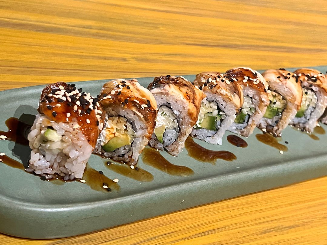 Aguacate, pepino, queso crema, unagi en rebanadas, salsa glaseada de ajonjolí.